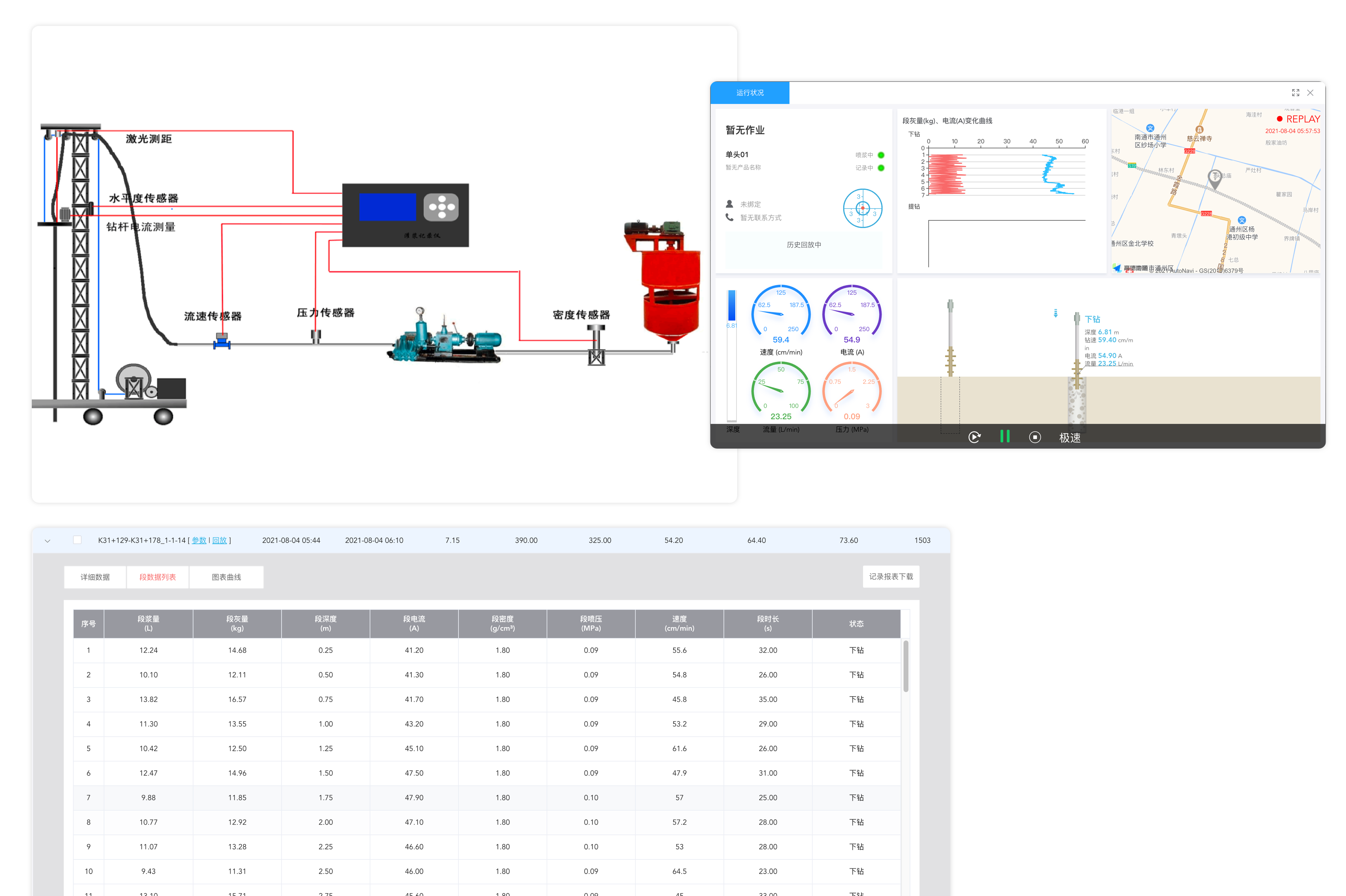 利用高精度定位,物聯(lián)網(wǎng)傳感器等技術(shù),在施工過程中實時采集鉆樁深度、鉆樁速度、鉆桿電流、傾斜度、水泥漿流量、材料