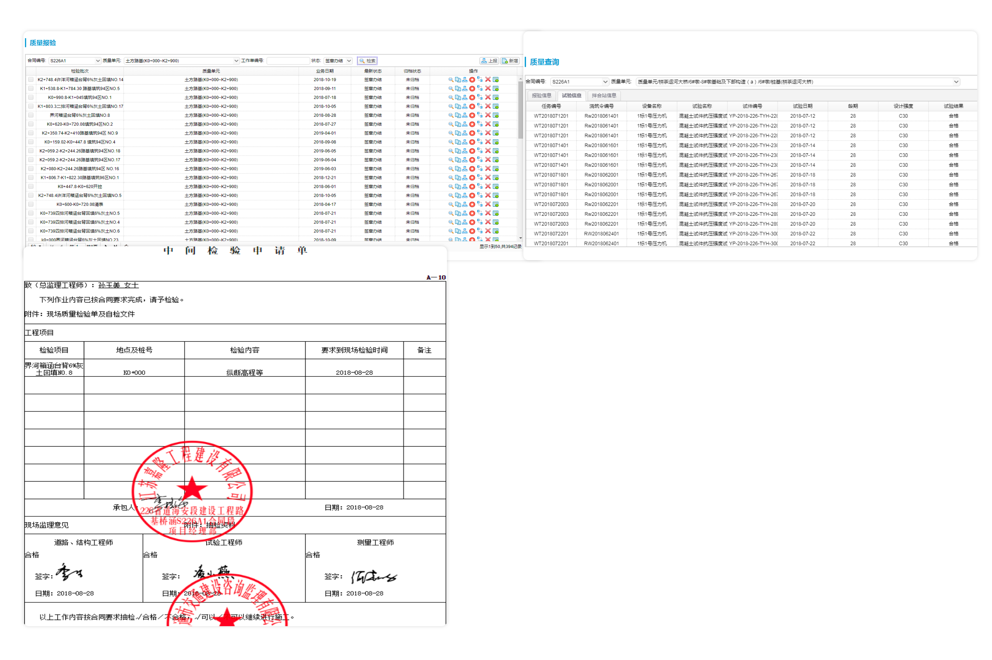 系統(tǒng)對路基、路面、橋梁等分項工程建立工序管理流程,按照管理單元對應(yīng)工序進行質(zhì)量報驗,質(zhì)量報驗關(guān)聯(lián)試驗資料、現(xiàn)場